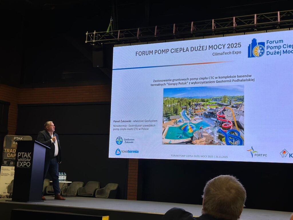 Podczas swojej prelekcji przedstawił studium przypadku kompleksu termalnego Gorący Potok w Szaflarach, pokazując, jak w praktyce wykorzystano gruntowe pompy ciepła CTC we współpracy z geotermią podhalańską.